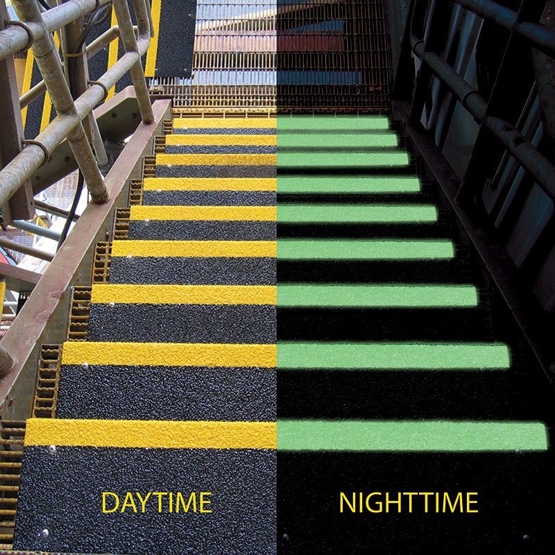 Photoluminescent glow-in-the-dark colors can offer extended safety for crew members and employees when darkness falls or power failures occur. Combine Glo-Traction® Colors and safety messaging to provide critical directions for escape routes on steps, walkways, and ladders in emergency situations. Our photoluminescent pigment is non-toxic, non-radioactive and can be recharged repeatedly during the life of the product.